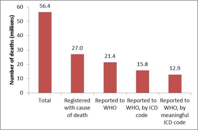 The United Nations Sustainable Development Goals for 2030 include around 15 targets for mortality-related indicators. The “gold” standard method for monitoring mortality and causes of death is a well-functioning civil registration system in which every death certificate has a medically certified cause of death. Unfortunately, in almost all low-income countries, and some middle income ones, death registration systems do not function well enough to produce data for reliable mortality statistics. The graph below from our 2017 WHO World Health Statistics report (http://www.who.int/gho/publications/world_health_statistics/en/) shows that around half of deaths worldwide are registered in a national system with medical certification of cause of death. Not all of these deaths are reported to WHO: about 40 % of global deaths are currently reported to the WHO Mortality database, which collects information on registered deaths and their causes from Member States which have them. Even fewer deaths have a meaningful cause of death code (ICD code), with many in some countries coded to ill-defined causes, symptoms, or non-informative immediate causes such as respiratory failure or heart failure.