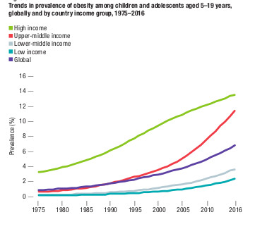 Analysis of these trends has shown that although population growth has played a role in the increase in numbers of obese children and adolescents, the primary driver has been an increase in the prevalence of obesity. Globally, the prevalence of obesity among children and adolescents aged 5-19 years increased from 0.8% in 1975 to 6.8% in 2016. Although high-income countries continue to have the highest prevalence, the rate at which obesity among children and adolescents aged 5-19 years is increasing is much faster in LMIC (see the following figure).