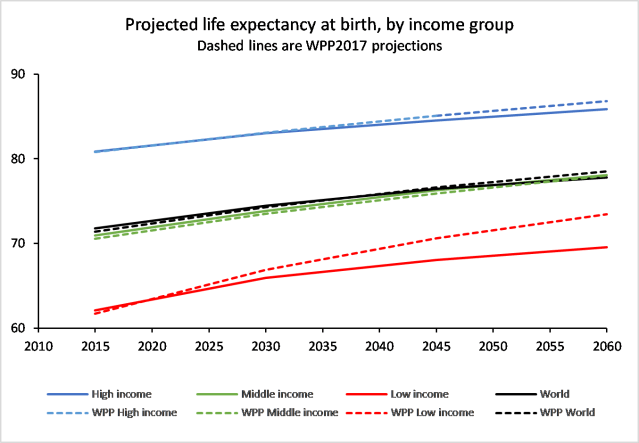 The following figure compares projected life expectancies at birth for the world and for countries grouped by income. The projections are very similar for the world and for middle- and high-income countries. The main difference is for low income countries (predominantly African) where the projected life expectancy is 1 year lower than the UN projected life expectancy in 2030 rising to 3.9 years difference in 2060.