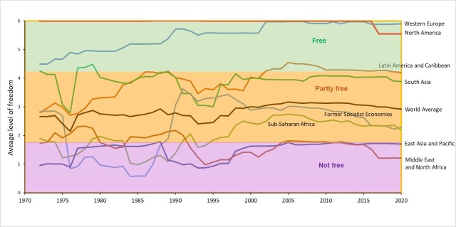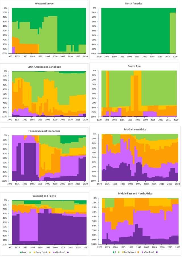 In the following graphs, I have plotted trends in the proportions of regional populations falling into each of the freedom categories. Because large populations dominate, and crossing one of the freedom thresholds will shift that entire population to another area, these graphs are more spikey than if I had plotted numbers of countries rather than people. For example, the large discontinuity in the purple sub-areas for East Asia and Pacific from 1977 to 1988 reflects the freedom score for China decreasing from 6.5 to 6 in that period. Similarly, the graph for North America shows the decrease in freedom from 2016 onwards in the USA with the index increasing one step from 1 to 1.5.