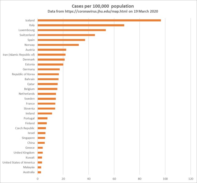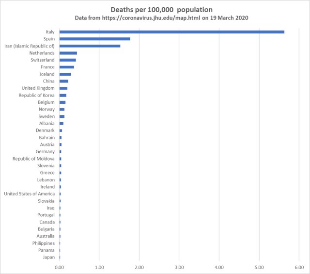 I was looking at the Johns Hopkins website that tracks confirmed cases and reported deaths from COVID-19. It lists countries in descending order and I realized I had not seen plots of cases or deaths per capita, so I made some using the numbers there today. (i’ve not shown San Marino separately to Italy, as it would dwarf Italy’s rates). Switzerland is the 4th highest country in terms of cases per 100,000 and 5th for deaths per 100,000 (after Italy, Spain, Iran and Netherlands).
