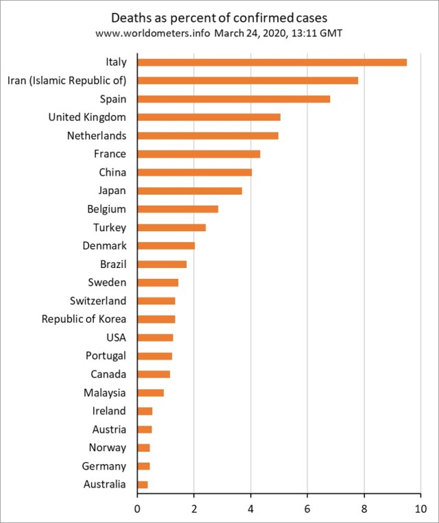 The cross-sectional comparison at one point in time does not give any sort of correct comparison of the overall final impact of the epidemics across countries, since countries are all at different points on the epidemic curve. A number of websites are tracking trends with the time axis defined in terms of time since 10th or 100th case.