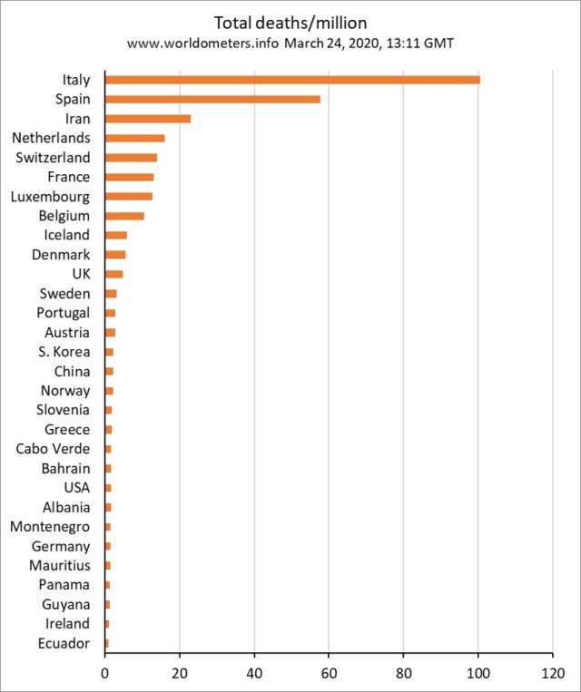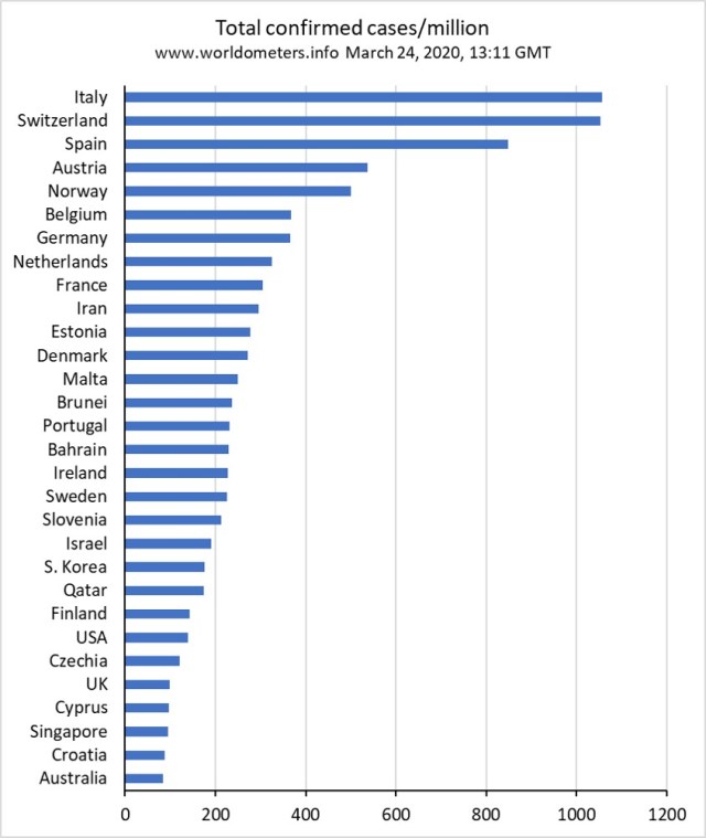 worldometers.info now also reports coronavirus cases and deaths as rates per million population. I’ve done some updated plots for confirmed case rates, reported death rates, and apparent case fatality rates (CFR). The latter are calculated simply as reported deaths per 100 confirmed cases using numbers on worldometers.info at 13.11 GMT on March 24. This may overestimate CFR for countries testing few people, or only people with symptoms (as in Switzerland), or may underestimate it when most cases are recent and deaths for those cases have not yet occurred.