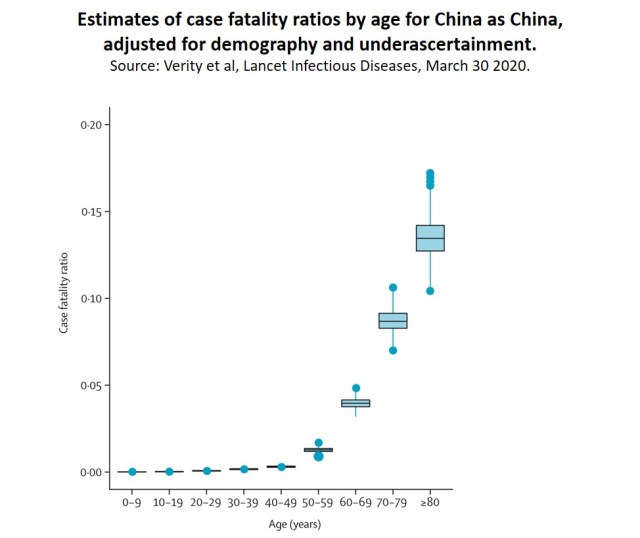 A paper published 2 days ago in the Lancet used data from China to estimate infection fatality ratios by age for all COVID-19 infections after adjustments for censoring (recent cases for which there has not been enough time for deaths to occur), demography, differential testing rates by age, and underascertainment. The second graph shows the resulting infection fatality ratios (as fractions -not per cents) by age group, corresponding to an overall infection fatality ratio of 0.65%. This is much lower than the crude confirmed case fatality ratio of 2.3%.