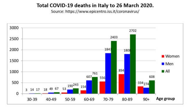 The first graph shows coronavirus deaths in Italy up to 26 March 2020 by sex and age. The overall case fatality rate for lab confirmed cases is 11.1% and 70% of deaths are male (closer to 80% below age 80, and it drops to 63% for 80 and above, because fewer men than women survive to their 80s. This is a much higher apparent case fatality rate than other countries and it is often mentioned as an explanatory factor that Italy has the oldest population in Europe. How much do differences in age structure of populations affect overall crude case fatality rates?