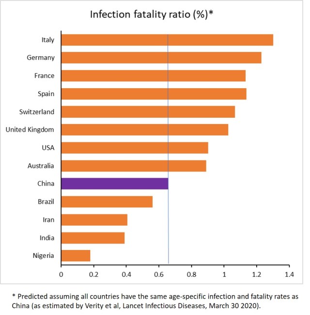 Note: these do not represent real infection fatality ratios in countries. They are predicted overall ratios for all infections if age-specific infection and fatality rates are the same as those of mainland China.