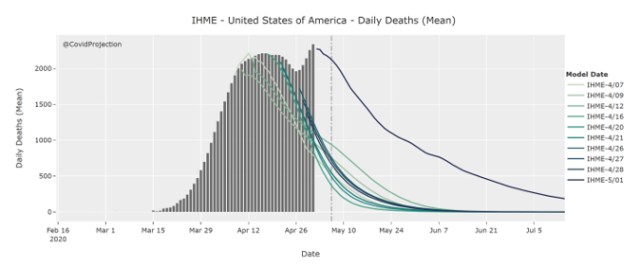 Vox recently published an excellent article on the problems with the IHME modelling of COVID-19. The article also gives a link to a site which has been set up so that you can look at the US predictions made by old versions of the IHME model (and another model). The IHME models are frequently fairly far off. Here is the comparison for the USA as a whole (you can also examine State specific projections).