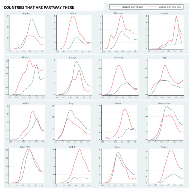 The plots below show smoothed death rates (per million) and case rates (per 100,000) up to 9 May using simple moving averages. Inspired by some plots on www.endcoronavirus.org I’ve organized the countries into three groups: those who have controlled the epidemic, those who are partway there (deaths are coming down, but not yet approaching zero) and those that need to take further action to turn things around. I excluded countries with population less than 1 million.