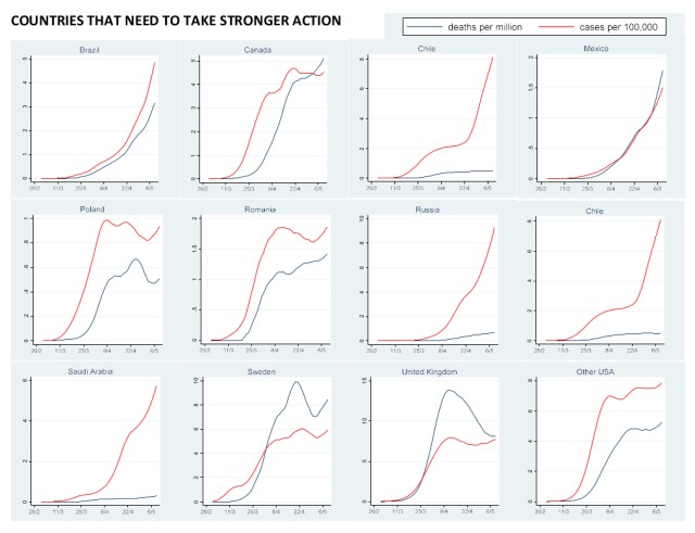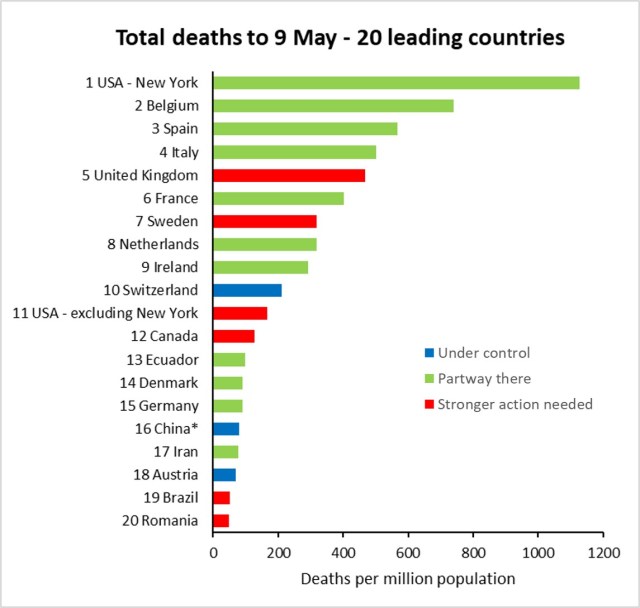 The final graph shows the top 20 countries in terms of deaths per million population, and their epidemic status. As to whether I’ve grouped the countries appropriately, there are a number where its debatable which group they should be in, and a few days more data may clarify what progress is occurring.