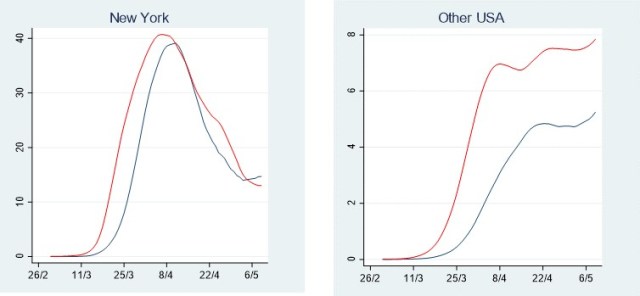 I downloaded the latest COVID-19 data for reported deaths and confirmed cases from Johns Hopkins this morning to see whether the data supports the relaxation of social isolation that is starting to happen in many countries. The USA now has 1.35 million confirmed cases (just under 1/3 of the global total) and 80,323 deaths (28% of the global total) and the trends are quite different for New York and the rest of the USA, as shown in the plot below. So I have done separate plots for New York and USA excluding New York in the following plots.