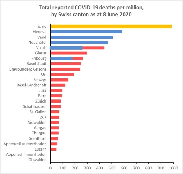I plotted the total reported coronavirus deaths as at 8 June 2020 as rates per million population by canton in the graph below. I thought about doing a density plot, but as some cantons have populations confined to valleys between Alpine peaks, the density issue may not be straightforward. Instead, I highlighted the language differences. The yellow bar denotes the canton in which Italian is the dominant language, Ticino, and it has the highest death rates because it borders northern Italy where the epidemic hit early and hard, and the border was not closed until well into the epidemic. The blue denotes cantons where French is the dominant language, and red where German is the dominant language. Clearly Romandy (the Swiss French population in the west of Switzerland) was hit much harder than Alemannic Switzerland (the part that speaks the Alemannic dialect of German known as Schweitzer Deutsche.