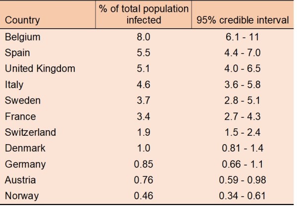 Overall, they estimated that between 12 and 15 million people had been infected in the period, or between 3.2 and 4 percent of the population of the 11 countries. The table below shows the estimated infection rate for each of the 11 countries.