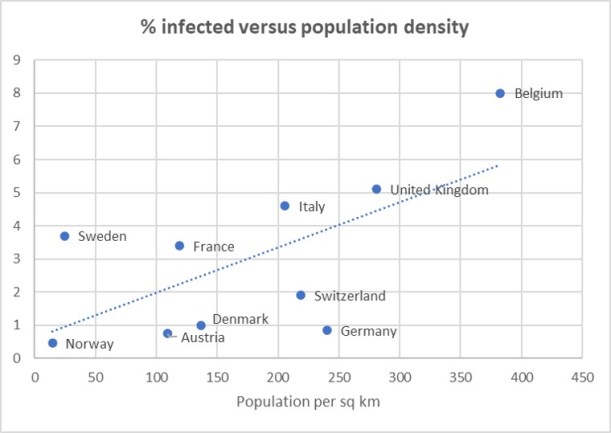 I’d recently seen a plot of US states coronavirus rates against population density showing a strong correlation. I did a similar plot below for the 11 European countries, with linear trend line. Belgium and Sweden are outliers on the high side for infection rates, and Germany, Denmark, Austria and Switzerland on the low side. Of course, not too much should be read into this, as this analysis should really be done at subnational level, rural/urban at minimum or preferably, city, town, rural, which would require more detailed geographic breakdown within countries of the deaths.