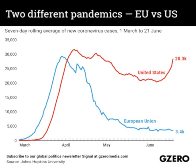 The trajectories of COVID-19 have been dramatically different in the USA and Europe. Currently there are close to 30,000 new cases per day in the USA, compared with around 3,000 per day in the European Union (and around 20 per day in Switzerland which is not an EU member). Testing rates per million are similar in USA and EU, and the EU population is 446 million compared to 332 million in USA. Almost half of US states are reporting significant upward trend in new daily cases. In most cases, this is not a “second wave” but a restart of growth after social distancing was relaxed while there had not been any substantial downturn in new cases.