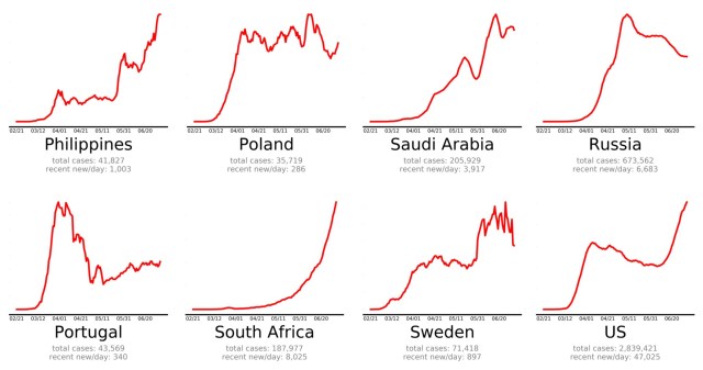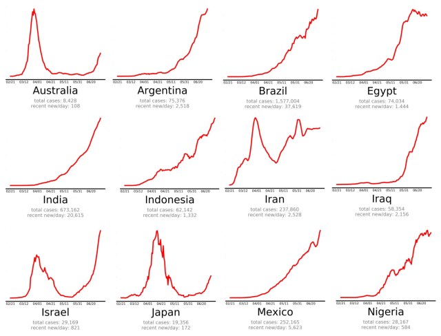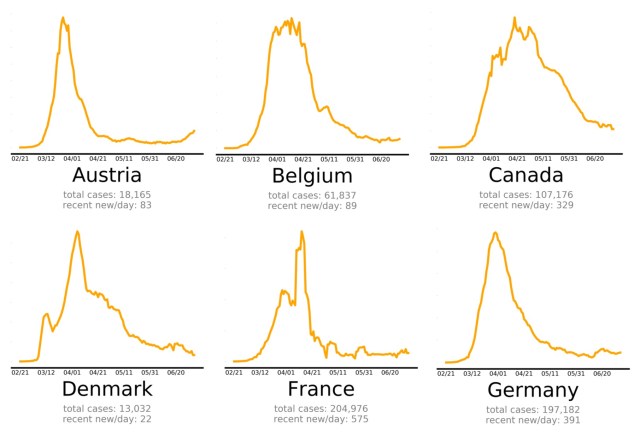 A couple of months ago, I was producing country plots of time trends in cases and deaths to see how the epidemic was evolving across the world. Since then, a very nice site https://www.endcoronavirus.org/countries has been doing these plots and updating them almost daily. The site groups countries into three groups: (1) those that are beating Covid-19, (2) those that are nearly there, and (3) those that need to take action. The plots show new cases per day averaged over the last week and each graph has been normalized so all the peaks are the same height. This better shows the trend in the data and the degree to which the epidemic is being controlled, though not the relative magnitudes of the epidemics in different countries.