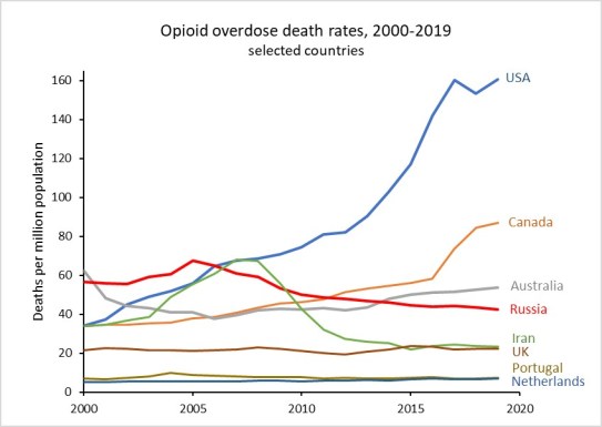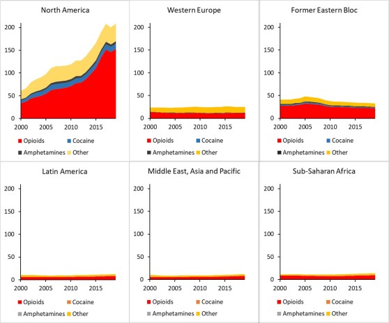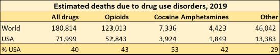 I estimate that globally, drug use disorders caused close to 181,000 deaths in 2019, of which 40% were in the USA. The global average death rate for drug use disorders was 15 per million population, compared with 219 per million for the USA. In other words, the USA rate is 15 times higher than the global average.