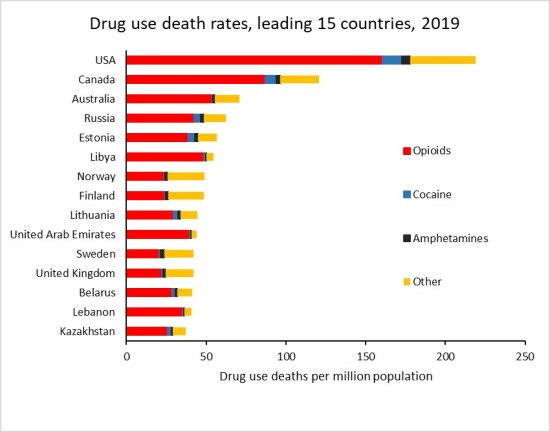 In terms of the overall drug disorder death rate in 2019, the four leading countries were the USA (219 per million), Canada (121), Australia (71) and Russia (63). Opioids are responsible for many more deaths than other types of drugs. The following graph shows the drug use death rates for the 15 leading countries in 2019, with the contributions of opioids, cocaine, amphetamines and other drugs.