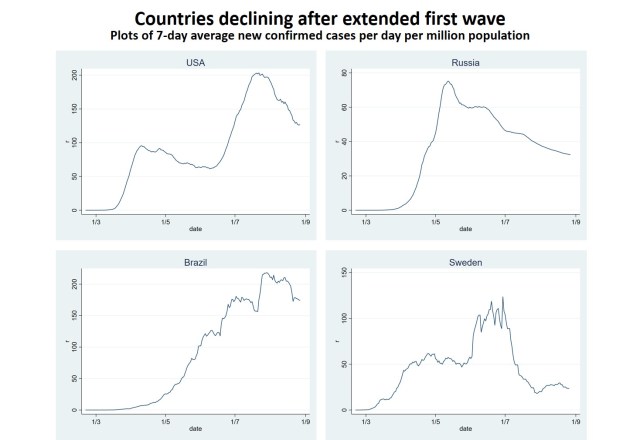 The last figure shows four countries who have had an extended first wave, now declining, and may or may not yet have a second wave. It is no coincidence that three of the four countries in this category – Brazil, Russia and the USA – are led by far-right nationalists who use technology as a tool for disinformation, demonize minorities and ignore climate change. Sweden was one of the few European countries not to impose a compulsory lockdown and has had a much more extended epidemic as a result. It did ban gatherings of more than 50 people, but other measures were voluntary. Though I saw a post from a Swedish man recently, saying he was having a lot of trouble coping with the social distancing of 2 metres and asking how soon he could go back to his usual social distance of 5 metres.