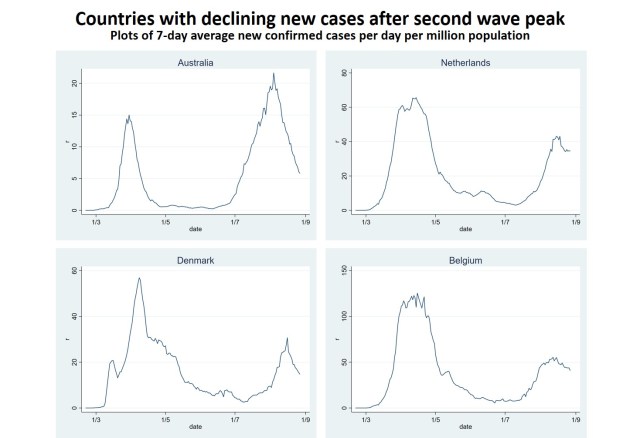 Today, I took another look at the second wave of the Covid-19 pandemic using data on confirmed cases downloaded from the Johns Hopkins University CCSE data repository. This post focuses mostly on western European countries, with a few others like USA and Australia included. The plots below show four countries where the second wave has peaked and is coming down. Australia is somewhat unique in that its second wave peaked considerably higher than the first. Croatia and likely Spain will join that club.