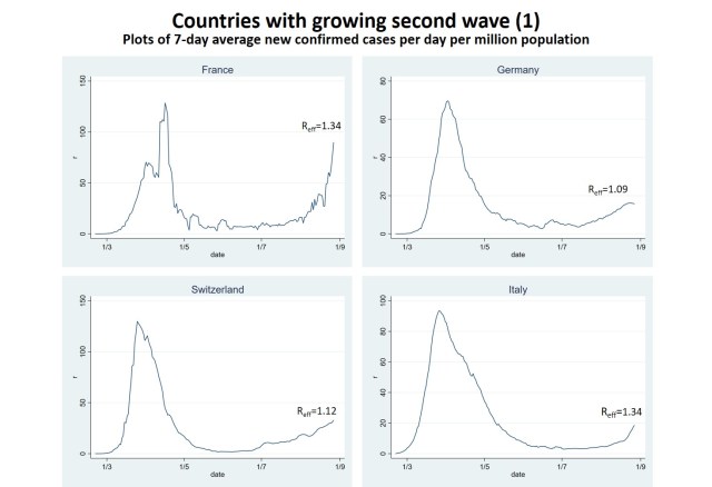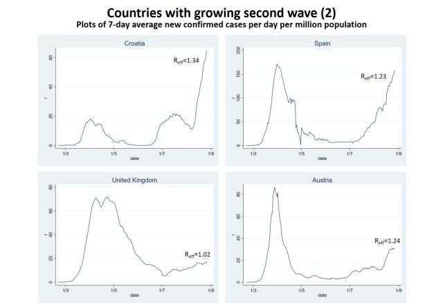 New cases are growing in Switzerland, but at a relatively slow rate with Reff = 1.12. The current new case rate is one quarter of that at the peak of the first wave, and if new cases continue to grow at the same rate, Switzerland will reach the same level as the peak of the first wave in 55 days. With children having just gone back to school, its possible the effective reproduction rate will increase. Perhaps more alarmingly, the Reff is substantially higher in all four countries neighboring Switzerland: France, Germany, Austria and Italy. The UK has imposed mandatory quarantine for travellers from Switzerland, who join those from France and Spain. The UK has the slowest growth rate of the countries in this group (among those I have looked at) and Croatia the highest, having already substantially exceeded its first wave peak more than threefold.
