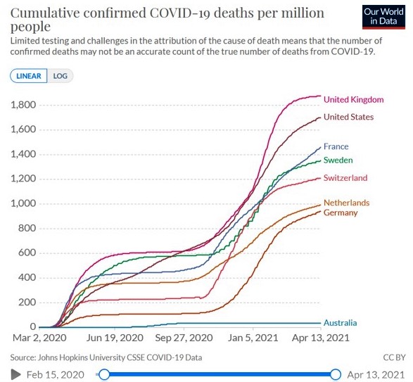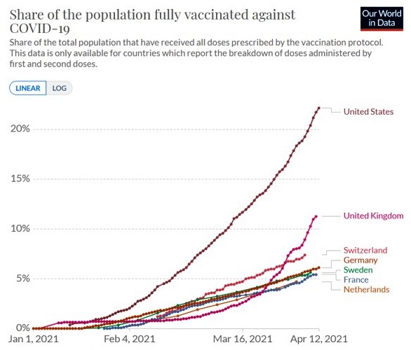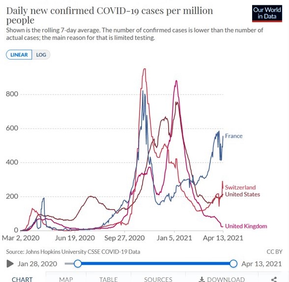 Switzerland has fully vaccinated 8% of the population, somewhat ahead of France and Germany and some other EU countries (see first figure). For some reason, the percent of people who have received at least one vaccine is no higher than France or Germany, who I presume are prioritizing first vaccinations over second. The percent vaccinated in Geneva is a little higher, probably around 9% and has been focused on people with various conditions and those 65 and over. The cantonal authorities are now extending vaccination to two new target groups – people aged 55-64 and 45-54.