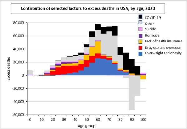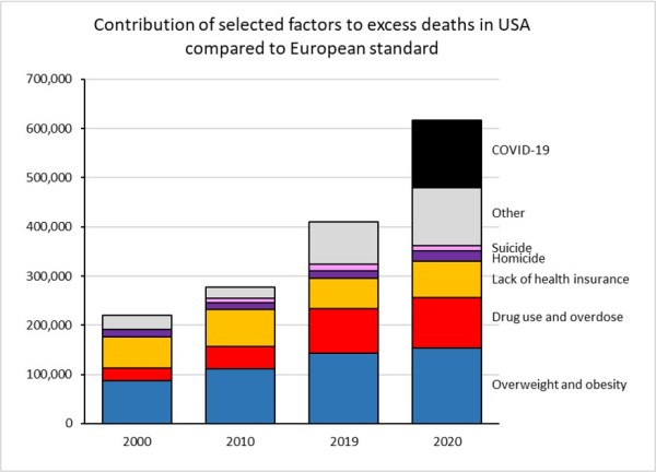 Figure 4 shows the approximate contributions of overweight and obesity, drug use and overdose, suicide, homicide, lack of health insurance and Covid to the US excess deaths relative to the European standard. Together these six factors account for around 80% of the excess deaths. Excess deaths due to alcohol use were not included as a separate factor in this graph because European and US death rates were quite similar, and the alcohol excess was small and actually negative in 2000.