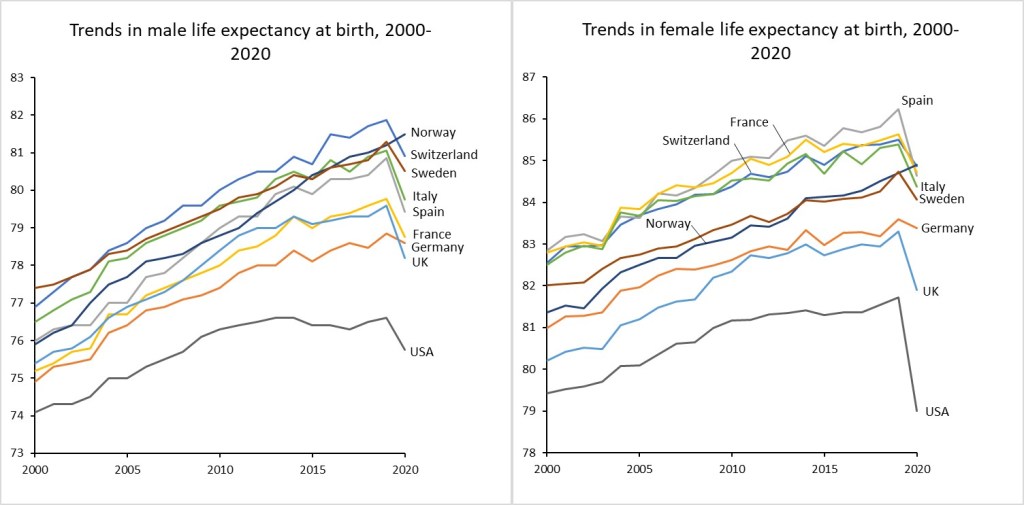Sam Preston and Yana Vierboom published a short paper in April which showed that Americans die at higher rates than Europeans and this translated into roughly 400,000 additional deaths in 2017 that would not have occurred if the USA had Europe’s lower age-specific death rates. That is about 12% of all American deaths and higher than the COVID-19 death toll of around 380,000 in 2020. In a recent Guardian article, they summarized this as “The mortality penalty that the US pays every year is equivalent to the number of Americans who died of Covid in 2020”. They also note that because people tend to die at older ages than those characterizing excess deaths, the total potential years of life lost are three times greater for the excess deaths than for Covid in 2020 (13 million versus 4.4 million).