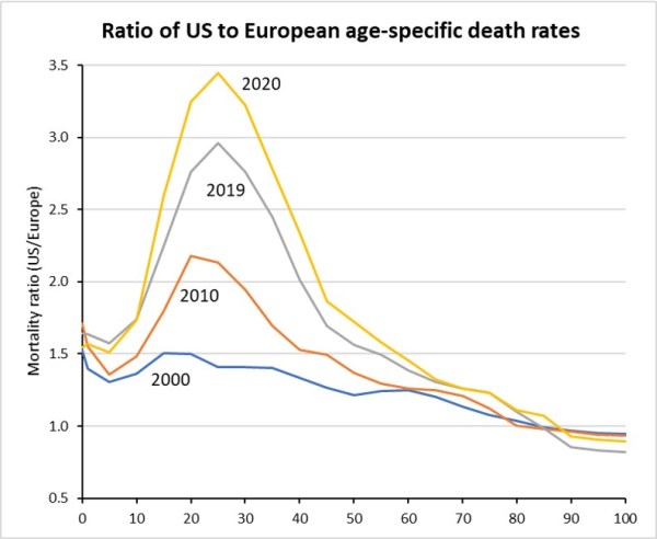Figure 1 below shows the ratio of US death rates to the average death rates* for the five European countries (the “European standard”) by age, in 2000, 2010, 2019 and 2020. US mortality rates are consistently higher than the European standard for all ages below 80 years and the ratio has gotten progressively worse throughout the 21st century. The ratio peaks among 25-29 year olds at almost 3 in 2019 and 3.24 in 2020.