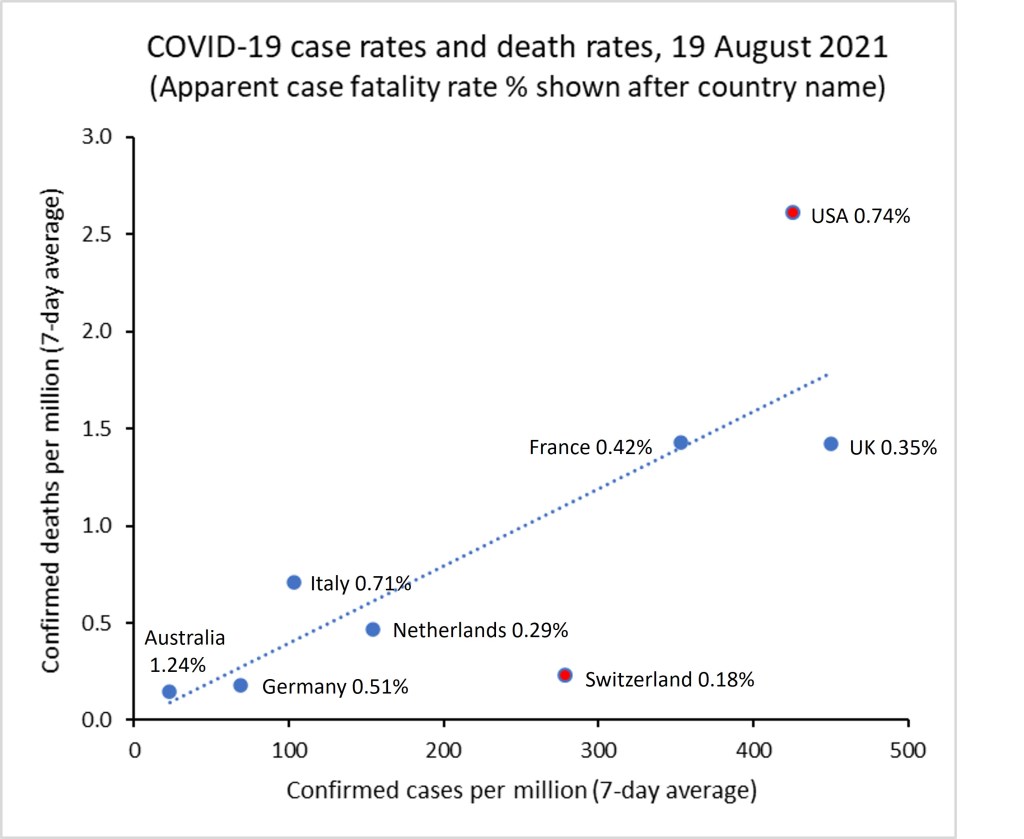 Ignoring Australia (which has very low case numbers and deaths relative to the other countries), there are two main outliers for apparent case fatality rates: Switzerland with very low CFR at 0.19% and the USA with a high CFR at 0.74%. Vaccination rates are similar in both countries, but my sense is that there is a huge difference with mask wearing and other social restrictions to limit transmission. And also large differences in health system access and health insurance coverage and adequacy.