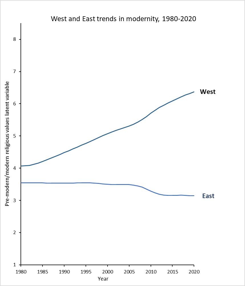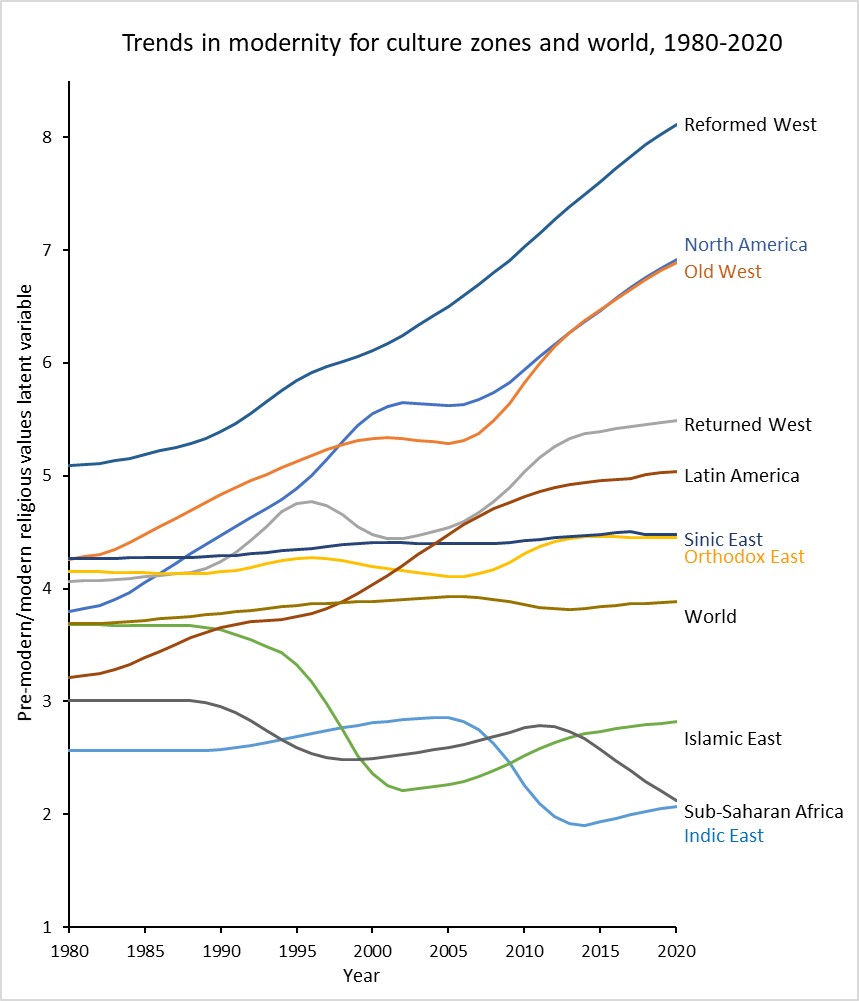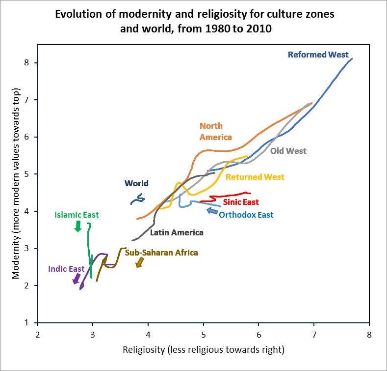 In contrast, the Islamic East, Indic East and Sub-Saharan Africa have all evolved in the opposite direction towards higher prevalence of pre-modern religious values and greater religious belief/practice. As a result, there has been negligible evolution of religiosity and modernity at the global average level.