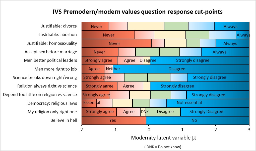 In revising my analysis of pre-modern versus modern religious values, I have slightly revised the set of IVS questions used to construct the latent variable. I dropped the question concerning belief in heaven and added a question concerning sexual freedom (approving of sex before marriage). Belief in heaven is highly correlated with belief in hell but has a somewhat higher population prevalence and is less discriminatory between modern and pre-modern values. In constructing the previous version of the modernity latent variable, I argued that sexual freedom issues were associated with the pre-modern values of the era when high fertility was important to ensure some children survived to reproductive age, and societies thus discouraged divorce, abortion, homosexuality. I excluded sexual freedom questions from the analysis on the grounds that the demographic transition to low child mortality, low fertility and widespread availability of reliable contraception is very recent and values are still changing in this domain. However, this is actually an argument to include at least one sexual freedom variable as a sensitive indicator of modern versus pre-modern values.