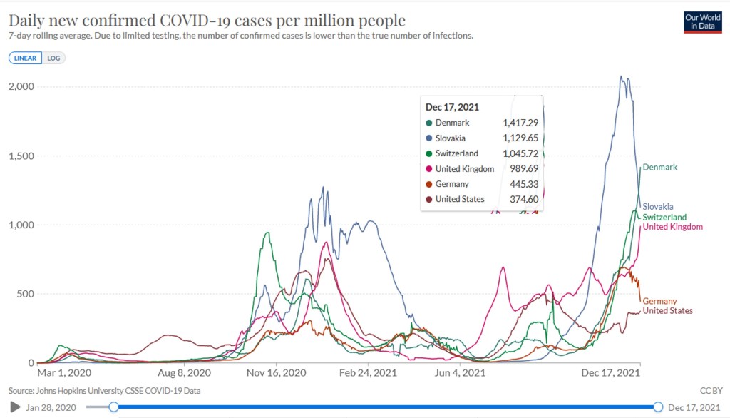 Switzerland now has the third highest daily new confirmed cases per million (averaged over last 7 days) at 1,045 per million. This is exceeded only by Denmark (1,417) and Slovakia (1,130). The UK is not far behind Switzerland at 990. At least the daily new death rate per million (7 day average) is quite low for Denmark (1.43) and Switzerland (2.69) compared to many countries (eg. USA and Germany both 3.9 per million). The comparability of these figures is influenced by differences in testing rates and differences in data collection, definitions etc.