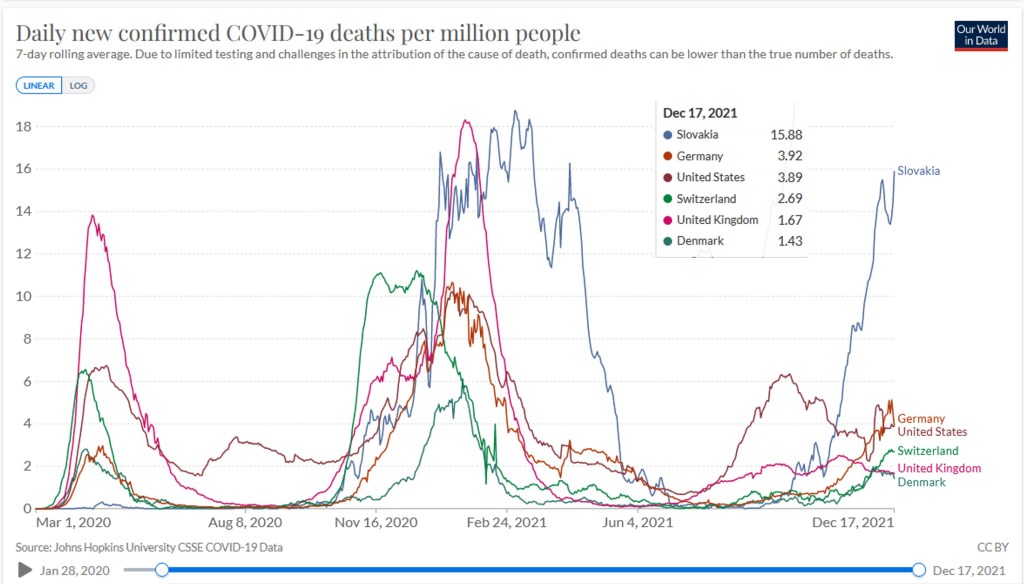 Apparent case fatality rates are low for Switzerland, UK and Denmark at 0.25% or lower. Germany and Slovakia have higher rates at around 0.7% and the USA even higher at 1.1%. Based on the limited genetic analyses available, omicron still accounts for only a few per cent of cases, ranging from 1% in USA to 4% in Slovakia, and all the rest is essentially delta now.