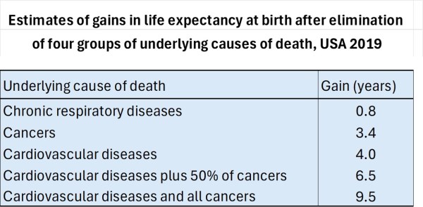 These differences may not seem particularly large to many so I have put them into context by doing some disease elimination calculations for the USA. Using the USA national life table for the year 2019 together with estimates of the cause of death distributions by age and sex for the USA in 2019 (taken from the IHME GBD2019 study data available here), I estimated the increase in US life ex, not quite pectancy resulting from the elimination of deaths for particular causes across all age groups. The results are summarized in the table below for selected causes.