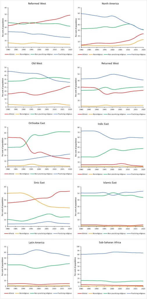 The following plots show trends in the prevalence of the four religiosity categories from 1980 to 2020 for 6 representive countries from different religious/culture zones. High income countries in Western Europe and North America are characterized by declining religiosity and rising prevalence of atheism. Former Communist countries of Europe are characterized by a drop in atheism after the breakup of the Soviet Union, some rising in the practicing religious and a much larger rise in the non-practicing religious. As noted in my previous post, the non-practicing religious see their religion (Orthodox Christianity or Islam) as a strong marker of cultural belonging and national identity [6]. The vast majority of people in Africa and Islamic countries are religious, though substantial proportions are non-practicing, and the prevalence of irreligion (non-religious and atheists) is very low.